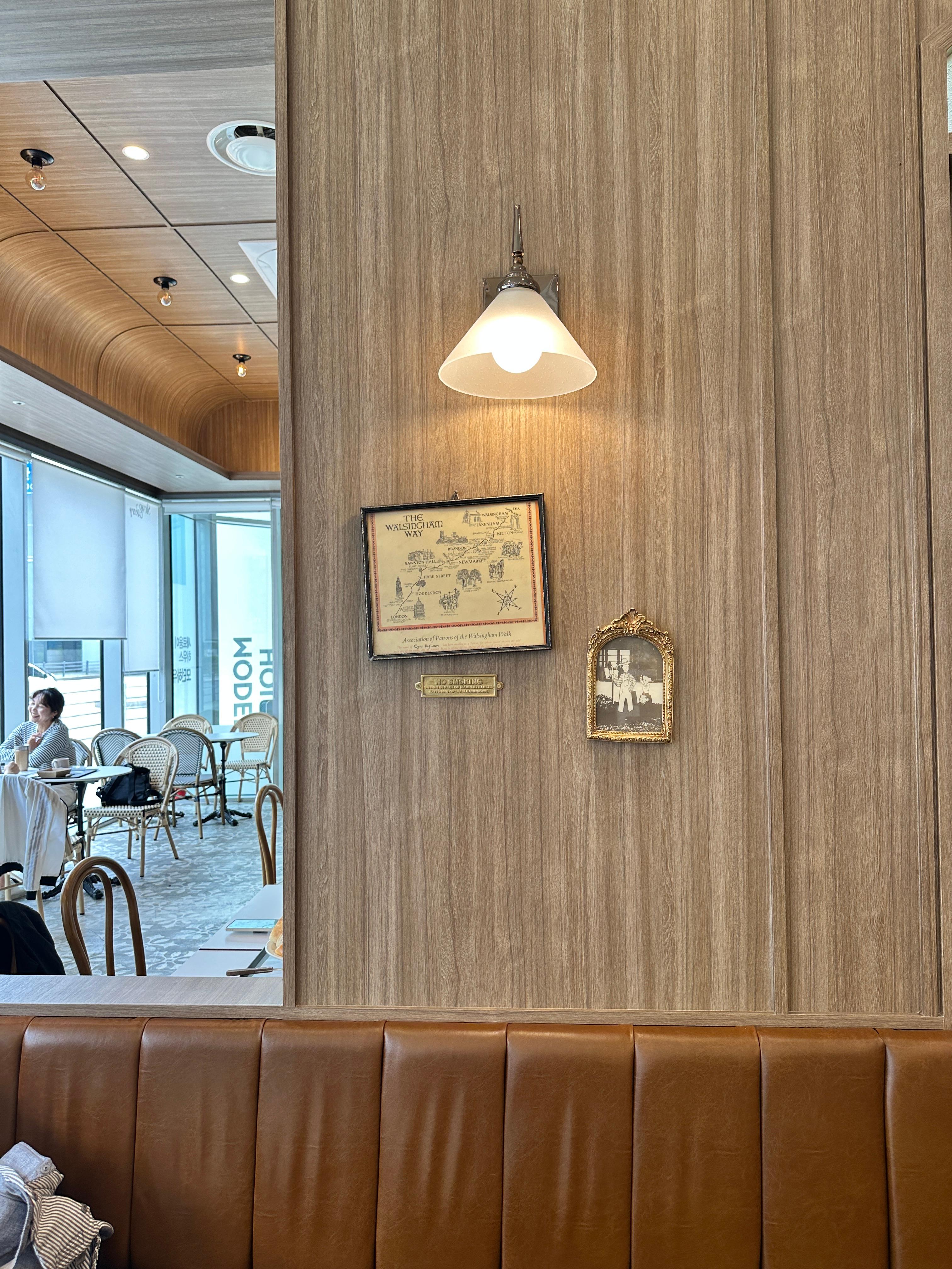 디저트 사진들이 걸려 있어 카페 특유의 감각적인 무드를 더해줍니다.